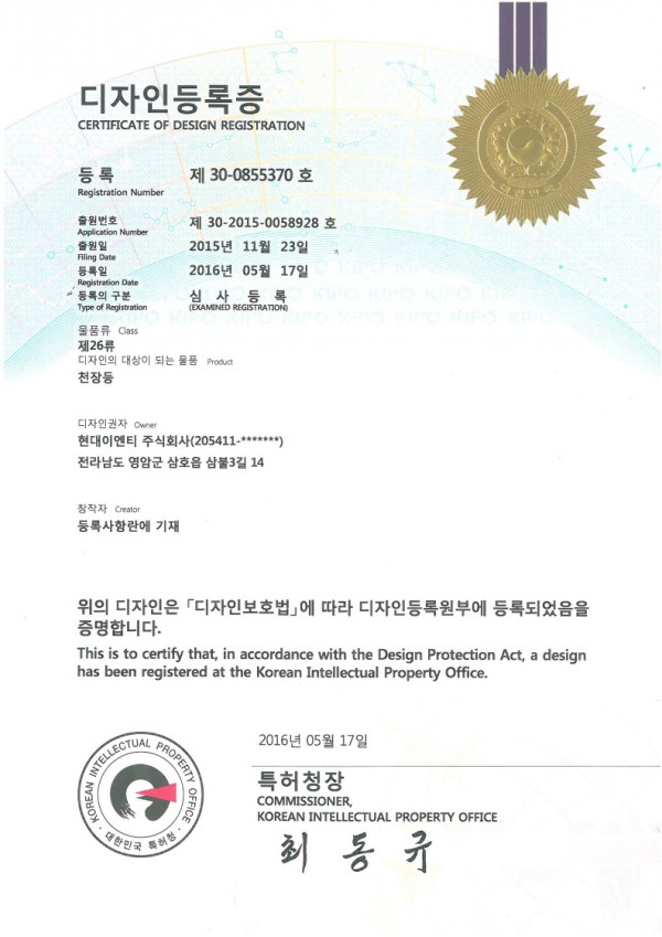 디자인 등록증 무궁화 천장등 디자인등록