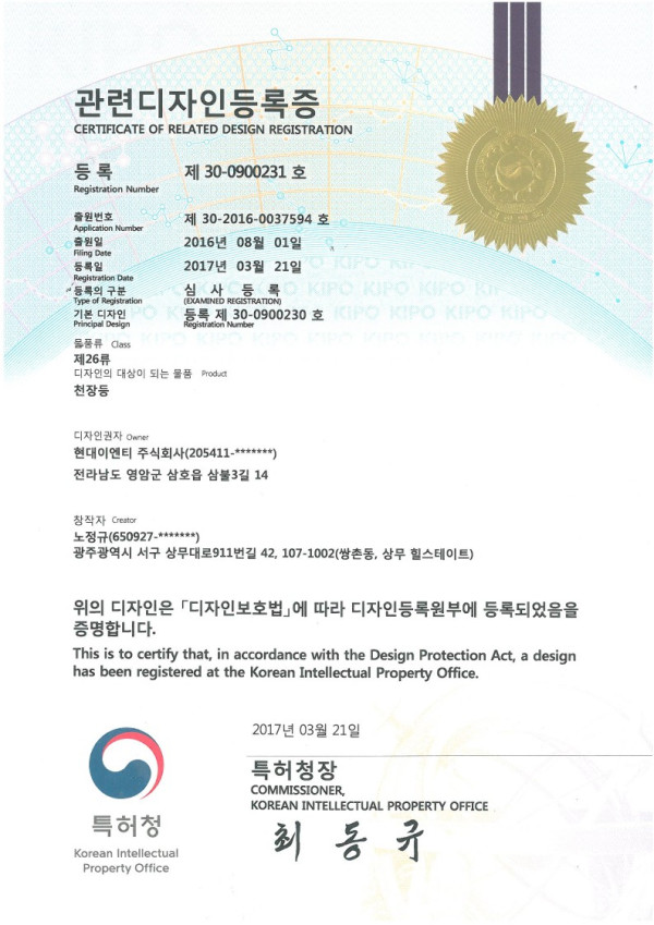 디자인 등록증 사각1 천장등 디자인등록