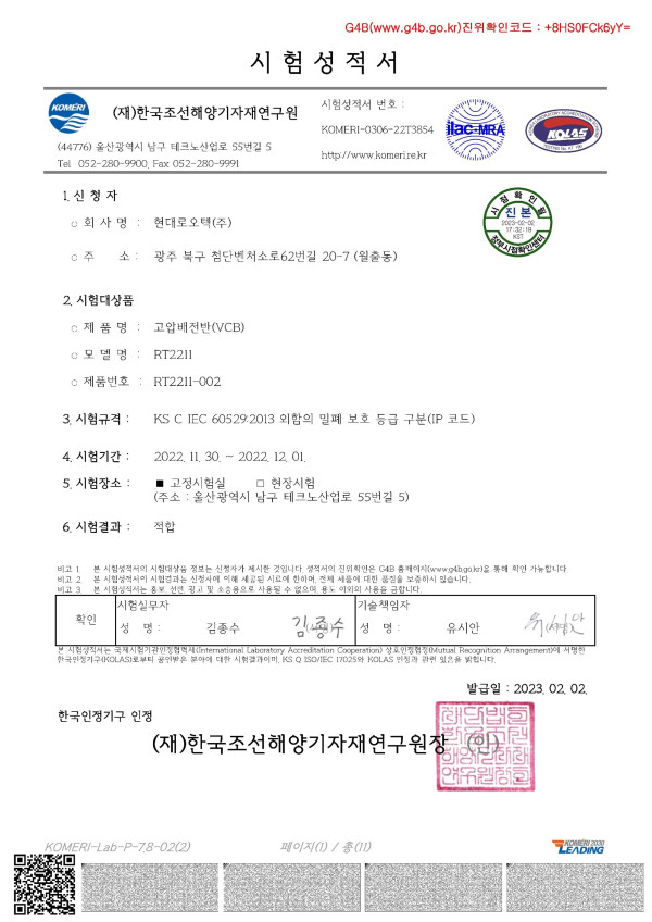 형식승인 고압배전반(VCB) 시험성적서