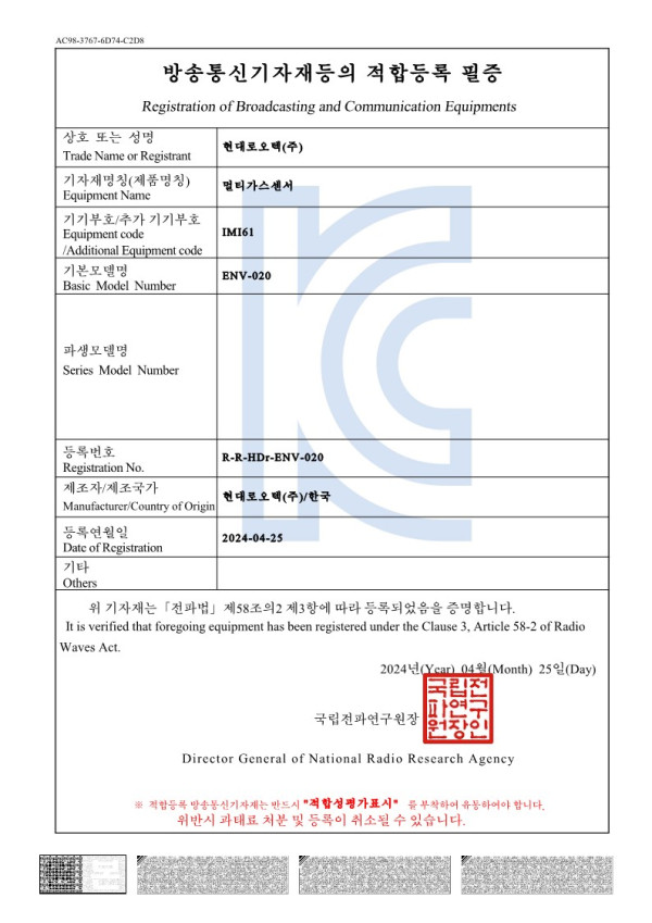 인증서 ENV-020 멀티가스센서_방송통신기자재등의 적합등록필증